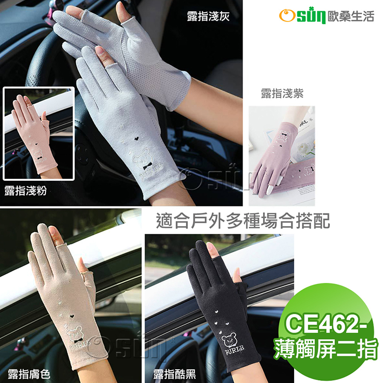 【Osun】女薄款戶外騎行開車彈性透氣刺繡防曬防滑觸屏露二指手套(多色任選,CE462-薄觸屏二指)