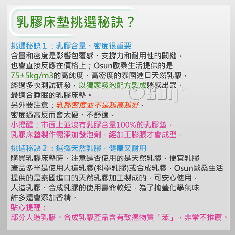 Osun歐桑生活提供的是75±5kg/m3的高純度、高密度的泰國進口天然乳膠,經過多次測試研發,以獨家發泡配方製成躺感出眾、最適合睡眠的乳膠床墊。