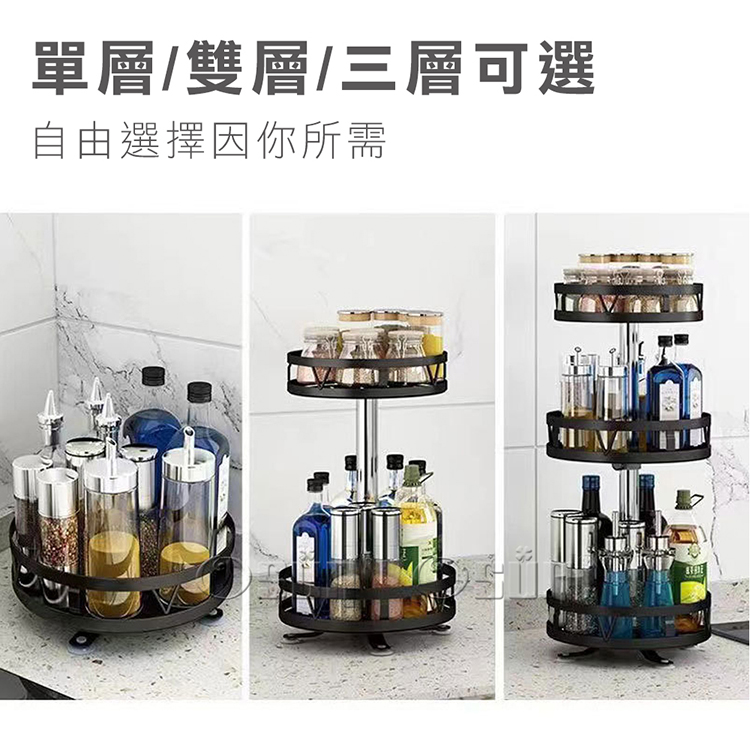 此款旋轉調味料置物架可以置放在多樣化的調味料,靈活調節層距的設計,即使是高瓶身的醬料罐也可以置放,360度旋轉能輕鬆取得,不用再小心翼翼的拿取後方的調味料。
