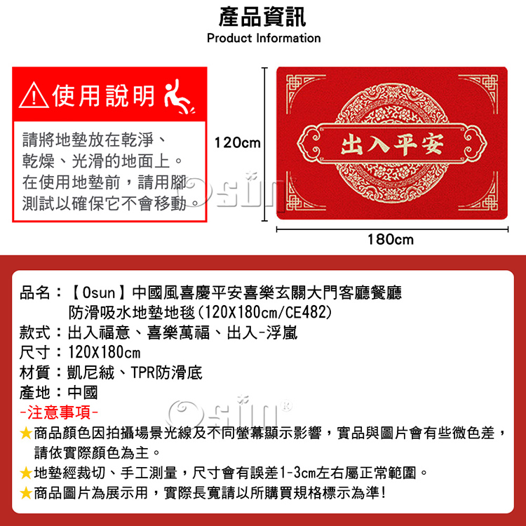 品名:【Osun】中國風喜慶平安喜樂玄關大門客廳餐廳防滑吸水地墊地毯(120X180cm/CE482)