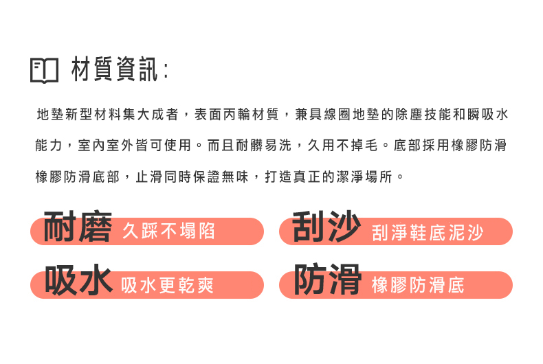 絨面耐磨除塵吸水,更好吸附鞋底的塵埃,即使下雨天,也能保持室內的乾爽,乾溼瞬間兩分離。