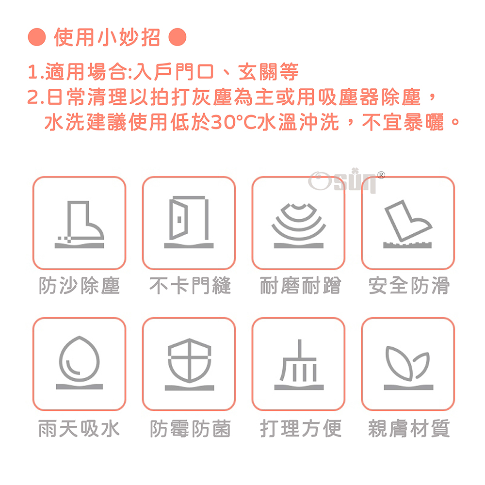 耐磨吸塵吸水,更好吸附鞋底的塵埃,即使下雨天,也能保持室內的乾爽。