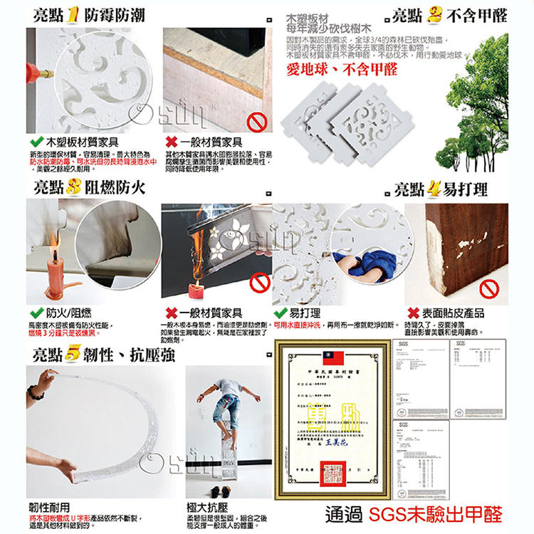 此產品使用木塑板沒有噴漆、貼皮、膠水等且不含甲醛與苯類,比日本4F級標準還低,是目前環保性能最優的傢俱材料。
